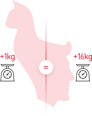 D'ailleurs, saviez-vous que 1 kg de surpoids chez le chat équivaut à 16 kg de surpoids chez l'homme ? Cette comparaison fait froid dans le dos, n'est-ce pas ?